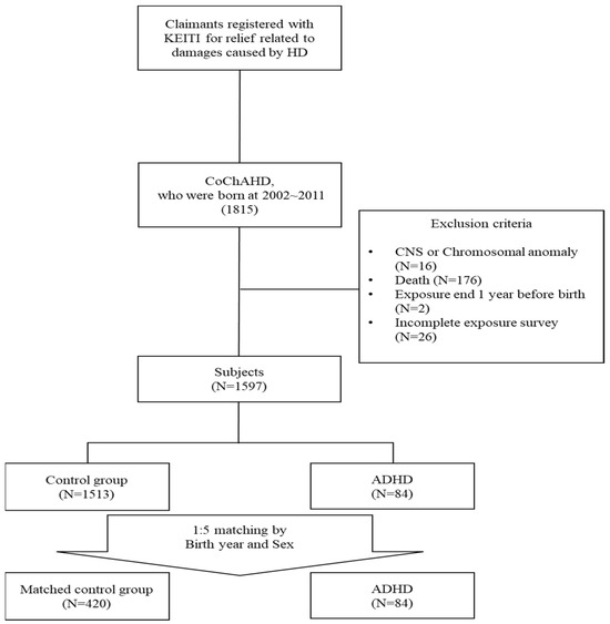 Study flowcharts. KEITI, Korean Environmental Industry and Technology Institute; CoChAHD, Cohort for Survey of Children and Adolescents Affected by Humidifier Disinfectants; CNS, Central Nervous System; ADHD, Attention-Deficit/Hyperactivity Disorder.