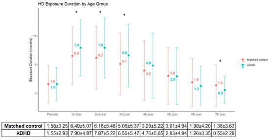 Annual HD exposure duration (months) by ADHD status: Error bars represent standard deviation. Significant differences between groups are marked with asterisks (*).