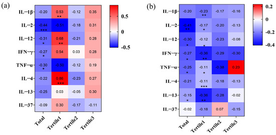 The relationship between urinary fluoride, Tregs, and cytokines: (a) The correlation between urinary fluoride and cytokines; and (b) the correlation between Tregs and cytokines across low, moderate, and high urinary fluoride levels; *, p < 0.05, **, p < 0.01, and ***, p < 0.001.