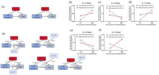 In summary, IL-2, IL-12, IL-13, IFN-γ, and TNF-α were identified as significantly correlated with urinary fluoride levels and Tregs counts. A mediation analysis further revealed that IFN-γ and IL-2 partially mediated the fluoride-induced elevation in Tregs counts (Table 4, Figure 2a). To further investigate the intricate regulatory mechanisms of cytokines involved in fluoride-induced Tregs recruitment, multiple moderation mediation analyses were conducted on the remaining cytokines to elucidate their potential interactions and roles. The results revealed that IL-12, IL-13, and IL-37 were involved in the indirect effects of fluoride on Tregs (Tables S4–S9). When classified into low (mean − SD), moderate (mean), and high (mean + SD) levels, it was observed that low-to-moderate levels of IL-12, IL-13, and IL-37 significantly modulated the indirect effect of IFN-γ on the fluoride-induced Tregs expansion. Additionally, the low-to-moderate expression of IL-12 and IL-37 influenced the IL-2-mediated indirect effect on the peripheral Tregs expansion induced by fluoride (Table S10, Figure 2b–g).