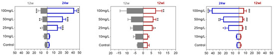 The results in Figure 3 show that the fluoride concentration in the urine of rats increased with the fluoride dose after 12 and 24 weeks of exposure. Specifically, the urinary fluoride levels in the 25, 50, and 100 mg/L groups were significantly higher than in the control group. Furthermore, after 24 weeks of fluoride exposure, the fluoride levels in the 50 and 100 mg/L groups were significantly higher than after 12 weeks of exposure. Following 12 weeks of being switched to purified water, the urinary fluoride concentrations in the 25 mg/L, 50 mg/L, and 100 mg/L groups remained higher than in the control group. However, no significant difference in urine fluoride was found between the water-improvement group and the 12-week fluoride exposure group, although it was significantly lower than in the 50 and 100 mg/L groups after 24 weeks of fluoride exposure.
