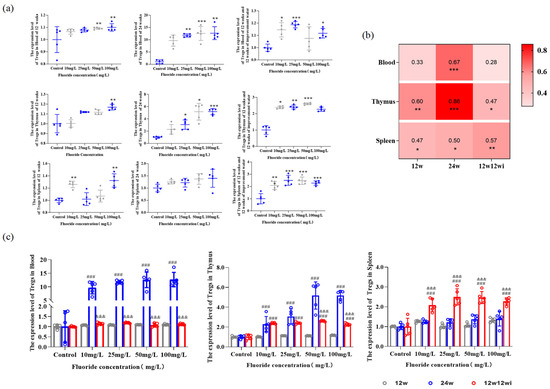 The relationship between fluoride exposure and Tregs changes in peripheral blood and immune organs of rats: (a) expression of Tregs in the thymus, blood, and spleen; (b) correlation analysis between urinary fluoride and Tregs; (c) Tregs expression at different time points and doses—Gray represents 12 w, blue represents 24 w, and red represents 12 w12 wi; *, comparison between control; &, comparison of 12-week fluoride treatment group and 24-week fluoride treatment group, and 12-week fluoride treatment and 12-week improvement water treatment group; # comparison of 24-week fluoride treatment group and 12-week fluoride treatment group, and 12-week fluoride treatment and 12-week improvement water treatment group; *, p < 0.05, **, p < 0.01, ***, p < 0.001; &&&, p < 0.001; and ###, p < 0.001.