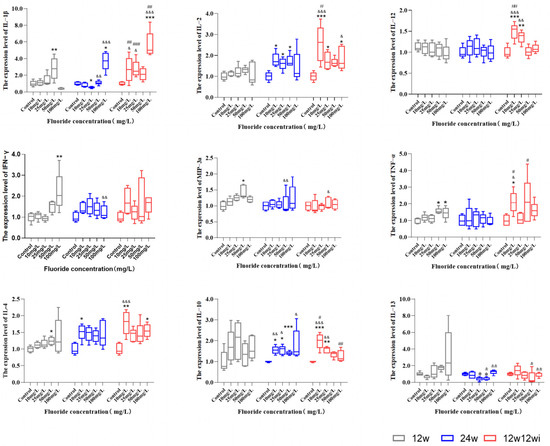 Cytokines expression at different time points and doses. Gray represents 12 w, blue represents 24 w, and red represents 12 w12 wi; *, comparison between control; &, comparison of 12-week fluoride treatment group and 24-week fluoride treatment group, and 12-week fluoride treatment and 12-week improvement water treatment group; # comparison of 24-week fluoride treatment group and 12-week fluoride treatment group, and 12-week fluoride treatment and 12-week improvement water treatment group; *, p < 0.05, **, p < 0.01, ***, p < 0.001; &, p < 0.05, &&, p < 0.01, &&&, p < 0.001; #, p < 0.05, ##, p < 0.01, ###, and p < 0.001.