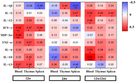 Through a correlation analysis, we explored the potential cytokines that may affect the changes in the number of Tregs in immune organs induced by fluoride. Figure 6 shows that, after 12 weeks of fluoride exposure, IL-1β exhibited a moderate negative correlation with the changes in the number of Tregs in the spleen. IFN-γ showed a moderate correlation with number of Tregs in the peripheral blood, thymus, and spleen. MIP-3α was associated with an increase in peripheral Tregs. TNF-α and IL-10 were correlated with increased thymus Tregs. IL-13 exhibited a positive correlation with a number of Tregs in both the peripheral blood and thymus. After extending the fluoride exposure to 24 weeks, IL-1β was related to the changes in Tregs numbers in both the thymus and spleen, with a positive correlation in the thymus and a negative correlation in the spleen. Spleen Tregs were positively correlated with IL-2 but negatively correlated with IL-13. IL-10 was negatively correlated with peripheral Tregs. After switching to purified water, Tregs in both the peripheral blood and immune organs showed a positive correlation with IL-2. The change in peripheral Tregs numbers was positively correlated with IL-12, IL-4, and IL-10, while the change in thymus-derived Tregs numbers was positively correlated with IL-10. Based on these results, we observed that, after 12 weeks of fluoride exposure, IFN-γ was correlated with changes in Tregs numbers from the peripheral blood and immune organs. After 12 weeks of fluoride exposure, switch to purified water and continue feeding for another 12 weeks; we then found that IL-2 was associated with changes in Tregs numbers in the peripheral blood, thymus, and spleen.