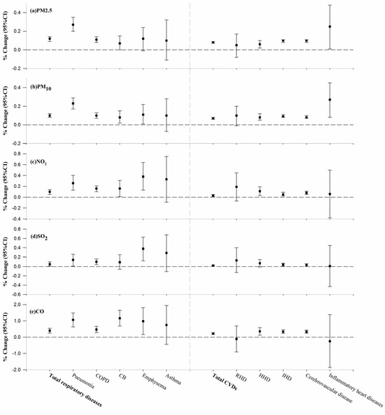 Figure 1. Percentage increases in the risk of death from respiratory diseases and CVDs on lag 0 due to short-term exposure to air pollutants.