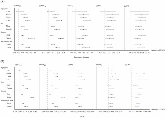 Figure 2. Percentage changes in mortality risks from respiratory (A) and CVDs (B) associated with increases in ambient pollutant concentrations stratified by the characteristics of the study participants. * p < 0.05.