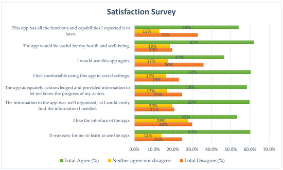 Ninety-three participants from two different academies (Connecticut and Miami-Dade Fire Rescue Academy) completed the satisfaction survey (beta-testing group). Responses were categorized into three groups: Total Agree, which included answers 5 (somewhat agree), 6 (agree), and 7 (strongly agree); Neither Agree nor Disagree, which included answer 4; and Total Disagree, which included answers 1 (strongly disagree), 2 (disagree), and 3 (somewhat disagree). Responses not answered or marked as “NA” were treated as missing data. According to the results (Figure 1), 60% of participants reported that it was easy for them to learn to use the app, 53% liked the app’s interface, and 60% found the information well-organized and easy to navigate. Additionally, 60% of respondents felt comfortable using the app in social settings, and 62% agreed that the app would be useful for their health and well-being. However, 36% of participants would not use the app again, 44% did not find it helpful for managing their health effectively, and 38% were not satisfied with the app. The full questionnaire responses, including NA responses, are provided in Supplementary Table S1.