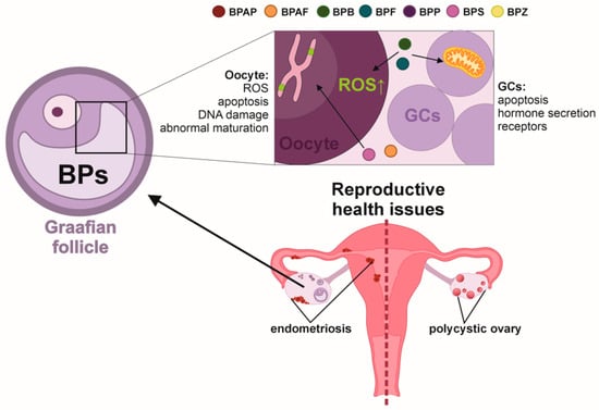 BPs have been shown to affect oogenesis and follicle formation during fetal and early postnatal periods. First, BPS maternal exposure in female mice impaired meiosis and oogenesis by increasing the percentage of oocytes enclosed in primordial follicles and reducing the number of antral follicles [52]. Additionally, due to reduced oocyte adhesion in nests, abnormal germ cell nests breakdown, and primordial follicle assembly is observed post-BPS treatment [53]. In another study, BPS led to oocyte over-loss by accelerating the breakdown of germ cell nests and the assembly of primordial follicles in neonates [54]. Furthermore, BPS has been found to decrease the expression levels of early folliculogenesis-related genes [54], further confirming its disrupting effects on oogenesis dynamics. In human studies, BPS has been shown to significantly affect the ovarian reserve [55]. Low doses of BPF affected spindle formation and epigenetic signs that translated into developmental competence damage [56]. Similarly, BPAF has been shown to delay meiosis initiation with the induction of oocyte aneuploidy. The observed impairments were accompanied by gene expression changes in fetal premeiotic germ cells, causing oogenesis defects [57]. The underlying mechanism for the observed changes remains unknown, but current data explain the observations by increased oxidative stress and apoptosis [54,58]. There are no direct data on the effects of BPAP, BPB, BPP, and BPZ on oogenesis.