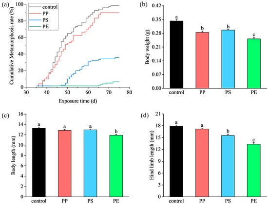 Chicago/Turabian StyleXiao, Shimin, Hao Chen, Xiyao Gao, Xinni He, Rongzhou Jin, Yunqi Wei, Shuran Li, Lei Xie, and Yongpu Zhang. 2025. "Effects of Exposure to Different Types of Microplastics on the Growth and Development of Rana zhenhaiensis Tadpoles" Toxics 13, no. 3: 165. https://doi.org/10.3390/toxics13030165