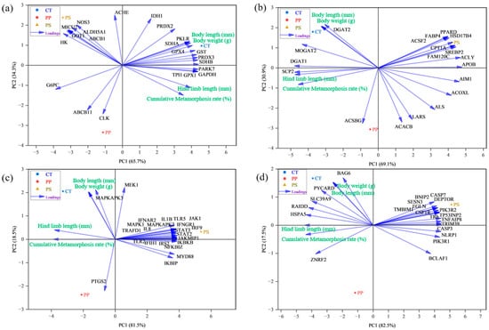 4.4. PP and PS Exposure Altered Transcription Levels of Liver Genes in Tadpoles
