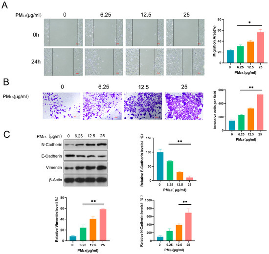 3.2. PM2.5 Promoted Invasive, Migratory, and EMT Induction Abilities in Beas-2B Cells