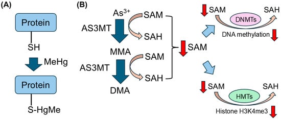 - Go, S.; Kurita, H.; Hatano, M.; Matsumoto, K.; Nogawa, H.; Fujimura, M.; Inden, M.; Hozumi, I. DNA methyltransferase- and histone deacetylase-mediated epigenetic alterations induced by low-level methylmercury exposure disrupt neuronal development. Arch. Toxicol. 2021, 95, 1227–1239. [Google Scholar] [CrossRef]
