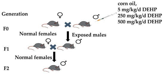 As shown in Figure 1, male mice were directly exposed to DEHP and mated (1:2) with DEHP-unexposed female mice to breed the F1 generation; then, male mice of the F1 generation were mated (1:2) with unexposed female mice to produce the F2 generation. The F1 generation is called intergenerational and the F2 generation is called transgenerational.
