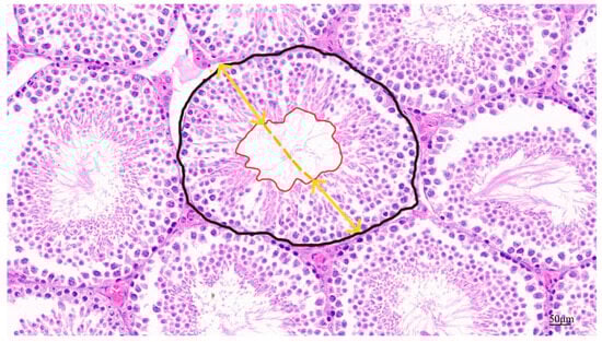 Fixed testicular tissue slides were stained with hematoxylin and eosin and photographed under light microscopy. Testicular tissue lumen area, seminiferous tubular area, epithelial height, and diameter were assessed. The black line area shown in Figure 2 indicates the cross-sectional area of the spermatogenic tubules and the red line area is the lumen area. The yellow line represents the vertical diameter of the varicocele, and the average length of the solid portion of the line represents the height of the varicocele epithelium [24]. Apoptosis in testicular paraffin sections was identified using a TUNEL staining kit (Servicebio, Wuhan, China) according to the instructions and the sections were analyzed using confocal fluorescence microscopy.