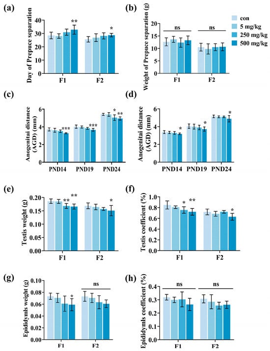 Reproductive system evaluation of male mice in F1 and F2 generations after paternal DEHP exposure. (a) F1 and F2 male foreskin separation time. (b) Weight of F1 and F2 male foreskin at separation. (c) Anogenital distances (mm) of F1 males PND14, 19, and 24. (d) Anogenital distances (mm) of F2 males PND14, 19, and 24. (e) Testis weight of F1 and F2 males. (f) Testicular coefficients for F1 and F2 males. (g) Epididymal weights of F1 and F2 males. (h) Epididymal coefficients for F1 and F2 males ((a–d), n = 9, (e–h), n = 6, *** p < 0.001, ** p < 0.01, * p < 0.05, and ns indicates no difference).