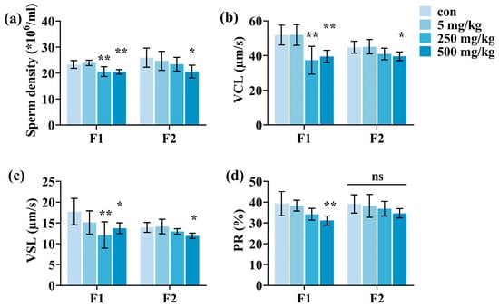 Evaluation of sperm quality in F1- and F2-generation male mice after paternal exposure to DEHP. (a) F1 and F2 male sperm density. (b) F1 and F2 male sperm curvilinear velocity (VCL). (c) F1 and F2 male sperm straight-line velocity (VSL). (d) F1 and F2 male percentage of spermatozoa with forward motile spermatozoa (PR%) (n = 6, ** p < 0.01, * p < 0.05, and ns indicates no difference).