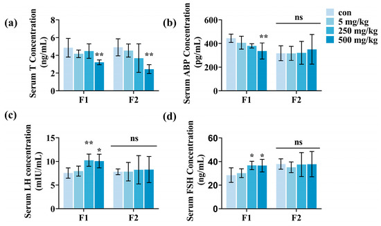 Male mice were weighed and bled in the eyeballs and then severed and executed, and the abdomen was cut open to rapidly separate the testes and epididymis bilaterally, which were weighed and recorded (testis coefficient = bilateral testis weight/body weight × 100%; epididymis coefficient = bilateral epididymis weight/body weight × 100%). Some organs were fixed with 4% paraformaldehyde, and the rest were stored at −80 °C. Determination of reproductive hormone levels in the serum of male offspring was conducted according to the instructions of the mouse testosterone ELISA kit, mouse LH ELISA kit, mouse FSH ELISA kit, and mouse ABP ELISA kit (Weiao Biotechnology, Shanghai, China).