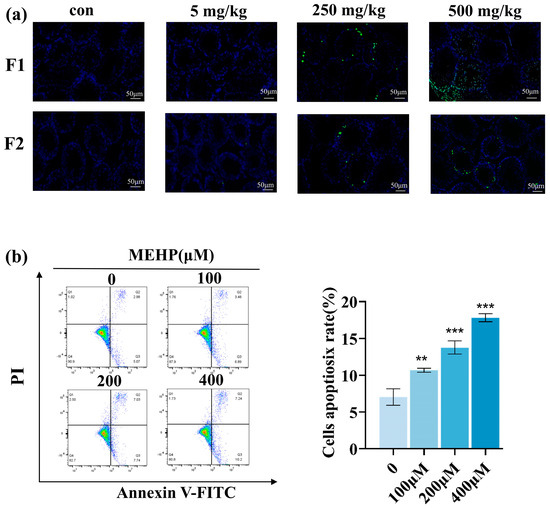 Testicular cell apoptosis in male offspring following paternal DEHP exposure. (a) TUNEL staining of F1 and F2 male testis tissues with a scale bar of 50 μM. TUNEL green fluorescent cells are apoptotic cells. (b) The apoptosis of TM3 cells treated with MEHP for 24 h was detected by flow cytometry. On the left is the representative flow scatter plot, and on the right is the percentage of apoptosis of TM3 cells (n = 3, *** p < 0.001, ** p < 0.01).