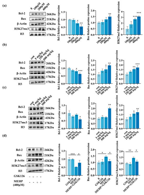 To further elucidate the occurrence of apoptosis at the molecular level in testicular cells following staining, Western blot analysis was conducted on animal and cell staining models. The results of the analysis show that the expression of Bax was elevated, while Bcl-2 expression was reduced after MEHP treatment of TM3 cells for 24 h (Figure 8a). Similarly, the protein Bax, which is linked to apoptosis, showed increased expression, and Bcl-2 exhibited decreased levels in the testicular tissues of male offspring following their fathers’ exposure to DEHP (Figure 8b,c). Furthermore, it has been established that the histone H3K27me3, an epigenetic modification, can inhibit Bcl-2 expression in response to environmental stressors, thereby promoting apoptosis. The findings of our study demonstrated an increase in H3K27me3 expression after 24 h of MEHP treatment in TM3 cells (Figure 8a), alongside heightened levels of H3K27me3 in the testicular tissues of male offspring (Figure 8b,c). To further elucidate the regulation of Bcl-2 by H3K27me3, we administered GSK126, an H3K27me3 inhibitor, to the TM3-treated group, effectively inhibiting the expression of H3K27me3 (Figure 8d). Subsequently, we observed a reduction in apoptosis, along with decreased expression of Bax and H3K27me3, and an increase in Bcl-2 expression (Figure 8d). The findings indicate that histone H3K27me3 is necessary for apoptosis in male offspring testis cells after paternal exposure to DEHP.