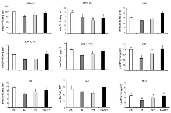 3.2. Effects of In Vivo Exposure to PA Microplastics and TCP in Mussels
