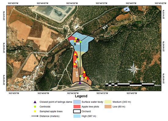 Figure 1 shows the map of the study area where the sampling was carried out on the apple trees surrounding the tailings dams of the mine. Three apple crop plots were identified, taking the centroids of the area of each crop plot as a reference point (low, medium, and high) based on their distance from the tailings dams. Two apple trees 80 m away from the centroid in each crop were selected to take the samples. Therefore, samples of the stem, leaf, pulp, and peel of the apple trees chosen were collected according to the experimental design. Likewise, soil samples where apple trees grow were collected to rule out whether the contamination is foliar or reticular absorption. The distances for taking the samples were ensured to be as precise as possible.