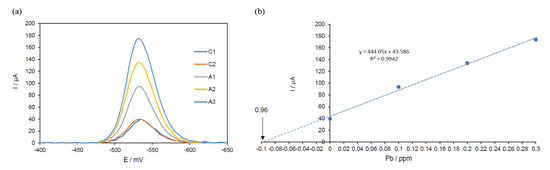 The results obtained in the voltammograms were analyzed with a data analysis program using the Origin Pro 8.0 software (OriginLab, Northampton, MA, USA). The baseline of the curves was eliminated. The maximum current intensity of the samples and the additions were plotted concerning the concentrations of the added aliquots of the stock solution of lead, resulting in a graph with an exponential growth trend (Figure 3a). Then, a linear regression of the data of the maximum current intensity obtained in the voltammogram versus the lead concentrations of each added aliquot was performed (Figure 3b). The value that is intersected with the ordinate corresponds to the sample concentration without dilution factors. Finally, the obtained value was multiplied by the dilution factors (125 of the digestion and 2 of the cell) to obtain the lead concentration.
