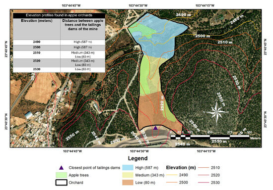 Figure 4 shows the elevation profile from the tailings dams of the mine to the apple orchard. It can be observed that the average elevation profiles of the tailings dams and apple orchards are 2530–2550 and 2490–2530 m above sea level, respectively. Although the elevation difference between the tailings dams and the apple orchard would promote the conditions for leaching heavy metals in the soil, the orography as a climatic factor of the terrain prevents leachates from moving towards the apple orchard, generating a natural barrier that surrounds the surface of the nearby soil between the crop area and the mine tailings.