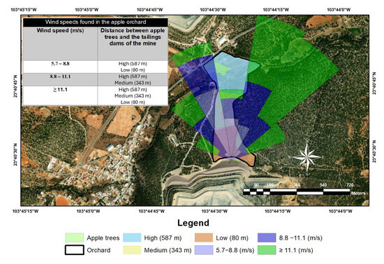 Figure 5 shows the predominant wind direction of the study area. It can be noted that the flow vector of the predominant wind direction that goes from the tailings dams to the apple orchard is North-Northeast (NNE) and North (N), with an average velocity between 5.7 and ≥11.1 m/s. Both climatic elements (direction and velocity) promote the conditions for a possible wind dispersion of particles to the crop plot. Based on the results of the ANOVA, shown in Table 5, the distance between apple trees and the tailings dams was not a significant factor. Hence, fruit contamination could be attributed to the dispersion of particulate material with lead content towards the apple orchard plots (atmospheric deposition) caused by the predominant wind direction and velocity (Figure 5). Therefore, the pathway for contamination was predicted as foliar absorption.