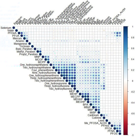 Pearson correlation heat map of included environmental pollutants and folate. Red circles indicate negative correlations and blue circles indicate positive correlations.