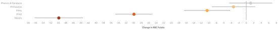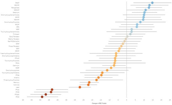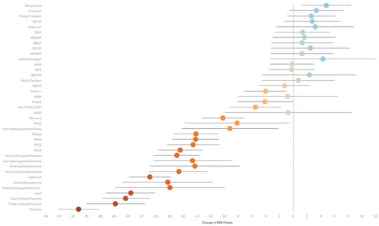Pooled estimates and 95% CIs for the associations between environmental chemical biomarkers and RBC folate using exposome-wide association study (ExWAS) analysis from the NHANES database from 2007 to 2016 using 70 imputed datasets (TEF = 2.01 × 10−3). Models were adjusted for age, race, sex, family to income poverty ratio, education, NHANES cycle, and HEI. Additional adjustments for urinary creatinine were made for models with chemicals collected in urine. Estimates represent the change in RBC folate concentrations for each doubling in chemical concentrations. Blue illustrates a positive estimate and red illustrates a negative estimate.