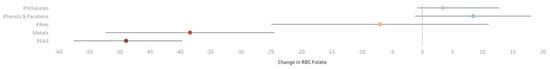One quartile increases in the metal (β = −38.36; 95%CI −52.31, −24.42) and PFAS (β = −48.86; 95%CI: −57.56, −39.61) mixtures were significantly associated with a decrease in RBC folate after adjustment. No other chemical families were statistically significantly associated with a change in RBC folate after adjustment (Figure 3).