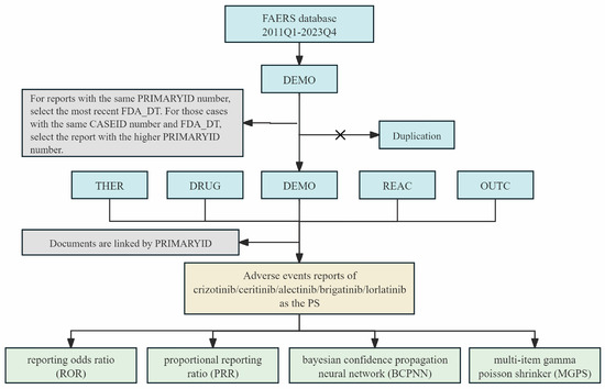 In pharmacovigilance research, disproportionality analysis serves as a key tool to assess potential associations between specific AEs and particular drugs [20]. A 2 × 2 contingency table (Table S2) compared the observed AE frequencies in ALK-TKIs recipients against the expected background rates in the full FAERS dataset. The disproportionality analysis method for AE signal detection includes the Proportional Reporting Ratio (PRR), Reporting Odds Ratio (ROR), Bayesian Confidence Propagation Neural Network (BCPNN), and Multi-item Gamma Poisson Shrinker (MGPS) method. The thresholds for signal detection followed the established criteria (Table S3). The ROR and PRR methodologies are highly efficient in identifying the relative risks pertaining to specific drug-event pairs. However, the ROR and PRR methods show high sensitivity but low specificity and are prone to false positives. The MGPS method can pull the disproportionality scores toward the null, thereby reducing the impact of spuriously high ROR values and thus detecting AE signals more reliably. The BCPNN method is a measure of the strength of the drug–AEs association. This integrative approach balances sensitivity and specificity through cross-validation. All analyses were performed in the R (v4.3.2) software.