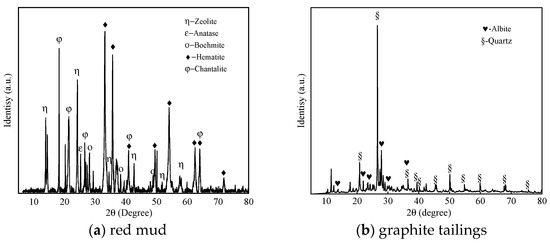 Figure 1 illustrates the XRD patterns obtained from red mud and graphite tailings. Red mud primarily consists of hematite, zeolite, and boehmite, consistent with previous reports [48]. Graphite tailings predominantly contain quartz and albite, a composition documented in the literature [49].