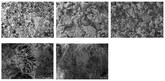 Figure 2 illustrates the microscopic diagrams of red mud, graphite tailings, and the mixture of red mud and graphite tailings with cement and ISS. Figure 2a,b depict the disparities in particle size and morphology between red mud and graphite tailings, revealing that red mud exhibits smaller particle sizes predominantly in a granular form, whereas graphite tailings are predominantly in flake form. These observations correlate with the outcomes of the XRD analysis. Figure 2c shows that in the absence of cement, the red mud and graphite tailings underwent only physical mixing, with no notable chemical interaction. Conversely, the inclusion of cement (Figure 2d) triggered a hydration reaction, yielding hydration products that facilitated direct bonding of the materials, thereby significantly enhancing their bonding attributes. Ultimately, Figure 2e demonstrates that the addition of ISS further stimulates the generation of cement hydration products. This is attributed to ISS’s ability to improve the hydration environment and provide additional active sites, thereby accelerating the hydration reaction [50]. This discovery underscores the potential of ISS to enhance the properties of cement-based materials, particularly in improving bonding characteristics.