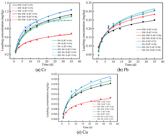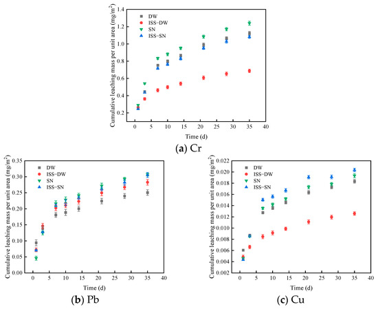 Figure 3 illustrates the cumulative leaching amounts of Cr, Pb, and Cu. The highest leaching concentration was observed for Cr followed by Pb, and the lowest was for Cu. The leaching curve revealed an increase in heavy metal leaching with time, particularly during the initial stages, where the curve exhibited a sharp upward trend before leveling off. The initial increase in leaching concentrations was attributed to the structural cracking that occurred in the test samples as they absorbed water. This cracking expanded the contact area between the samples and the leaching solution, which in turn promoted the dissolution of Cr, Pb, and Cu ions [52].