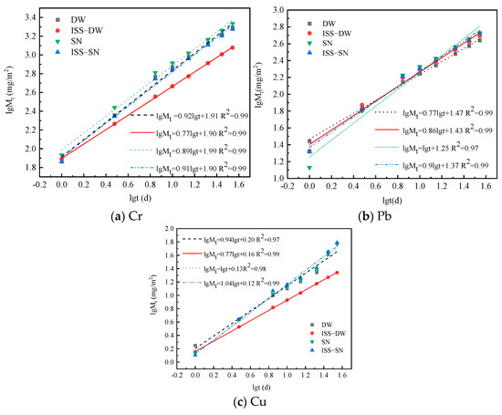 The relationship between cumulative leaching mass and cumulative leaching time for Cr, Pb, and Cu under varying conditions is delineated in the double logarithmic coordinate system depicted in Figure 5. Analysis of these graphs elucidates the leaching kinetics within the test samples, providing a comprehensive understanding of the leaching dynamics for Cr, Pb, and Cu. The slopes depicted in Figure 5, with values exceeding 0.65, indicate that the leaching of these heavy metals is not purely diffusive but also encompasses a dissolution component [56]. This dissolution component was likely influenced by the chemical composition of the test sample, its pore structure, and the interactions between the heavy metal ions and the curing agent.