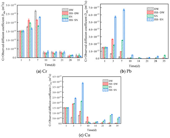 The Dobs were calculated using Equation (5) and are depicted in Figure 6. The leaching value for Cr ions in the initial 7 days was an order of magnitude greater than that in the subsequent period (10−14–10−13), and the Dobs tends to stabilize over time. A similar trend was observed for the leaching of Pb and Cu. The results indicated a faster initial leaching rate for these ions, validating the initial observations. As indicated in Figure 6, the Dobs for Cr varied from 6.69 × 10−15 to 1.51 × 10−13 m2/s, which is smaller than the Dobs values reported by Zhang et al. [57]. The Dobs values for Cu and Pb were also lower than those reported by Shi et al. and Sun et al., respectively [58,59].