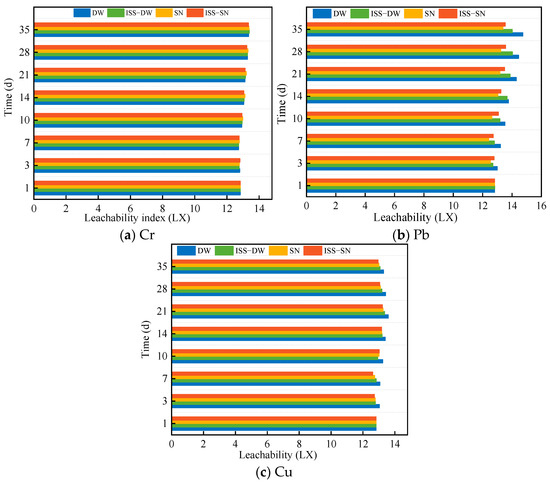 Leachability (LX) of (a) Cr, (b) Pb, and (c) Cu.