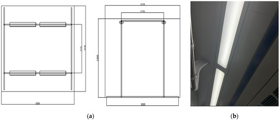Lighting system configuration within the experimental chamber (a) and real train ceiling lighting (b).