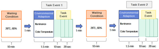 Calibration was performed for each subject during the experiment, and the subject was asked to maintain comfortable body and head postures and to minimize head movement. Data were recorded using the NIRSIT SCAN v1.3 software (OBELAB), beginning at the start of the experiment. The subject wore a blindfold for 1 min to stabilize brain activity, after which the blindfold was removed, light stimulation was provided for 1.5 min, and a task was performed for 30 s. The task was designed to be easy and to require approximately 30 s based on preliminary experiments. The task showed guide maps frequently seen in railway stations and subways and presented questions related to the information on the guide maps. Each subject repeated the same procedure for each combination of illuminance and color-temperature treatments for a total of approximately 30 min (Figure 4). After each experiment, the subject was taken to a separate area and asked to fill out a survey that included questions about their basic demographic information (e.g., name, sex, and age) and the subject’s emotional responses to the different lighting and color-temperature conditions.