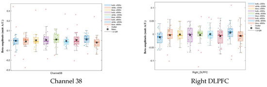 ANOVA results showed that channel 38 values were significantly different from the values of all other channels for all combinations of illuminance and color-temperature conditions (p < 0.05); there is a significant interaction effect between color and illumination on the oxyhemoglobin concentration in channel 38. And the Brodmann area, the right DLPFC produced significantly different results from all the other regions (p < 0.05; Table 1 and Table 2; Figure 5). The y-axis represents the parameter estimate, i.e., beta amplitude, and the unit is Arbitrary Units (A.U.). Outliers were identified using the IQR (interquartile range). This frontal lobe region is involved in work processes and reasoning ability.