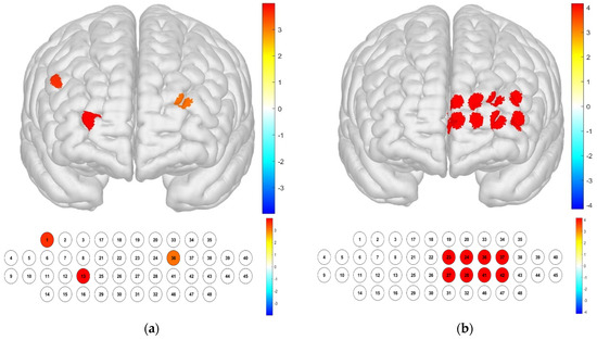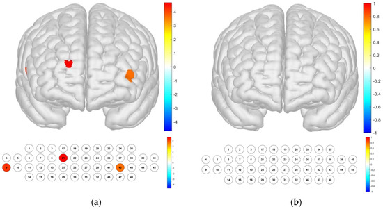 Brain activation analysis of responses to illuminance treatments for different channels (a) and the Brodmann area (b). (Two-way ANOVA on HbO concentration for illuminance; p-value from Student’s t-test (uncorrected p < 0.05)).