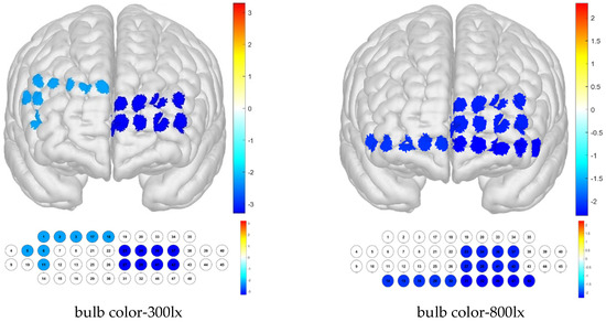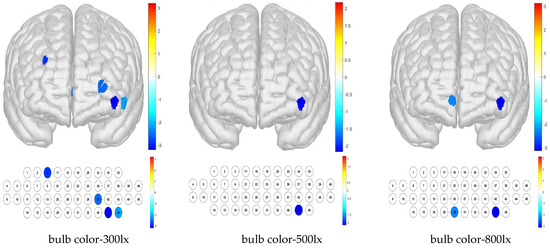 The one-sample t-test results show that when the sample mean is lower than other channels by condition, it can be deduced that the activation is small. Thus, low average activation was obtained for the bulb color–300 lx combination because of the contributions of channels 3, 41, 46, and 48; for the bulb color–500 lx combination, this was due to that of channel 47; and for the bulb color–800 lx combination, these were due to those of channels 30 and 46 (Figure 8).