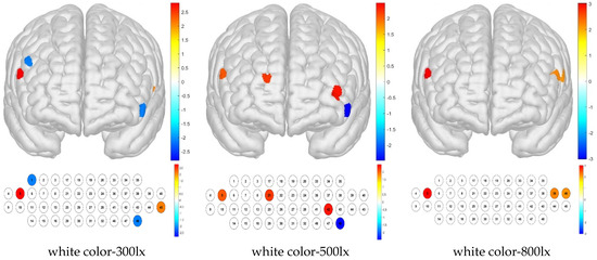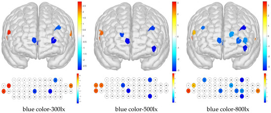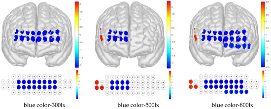 In this study, we considered two variables, illuminance and color temperature, and compared the data from three groups to verify their effects on each other. For the channels, we obtained mean oxyhemoglobin concentrations of −0.005 ± 0.062 mm × mM for an illuminance of 300 lx, −0.004 ± 0.065 mm × mM for 500 lx, and −0.006 ± 0.064 mm × mM for 800 lx; for the Brodmann area, we obtained mean oxyhemoglobin concentrations of −0.004 ± 0.040 mm × mM for an illuminance of 300 lx, −0.003 ± 0.042 mm × mM for 500 lx, and −0.004 ± 0.041 mm × mM for 800 lx. For the channels, we obtained mean oxyhemoglobin concentrations of −0.007 ± 0.063 mm × mM for bulb color, −0.002 ± 0.065 mm × mM for white color, and −0.006 ± 0.063 mm × mM for blue color; for the Brodmann area, we obtained oxyhemoglobin concentrations of −0.006 ± 0.040 mm × mM for bulb color, −0.002 ± 0.041 mm × mM for white color, and −0.003 ± 0.043 mm × mM for blue color. The results represent the mean oxyhemoglobin concentration for all 48 channels, with no channels being rejected. Thus, all mean illuminance and color-temperature values were negative, with differences in the degree of activation demonstrated in the cerebral hemodynamic response.