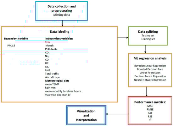 Classical regression-based algorithms, especially machine learning ones like Decision Trees and Random Forest, have been widely applied in forecasting air quality levels and characteristics. Regarding predictor variables, three main categories were discerned: variables associated with pollutant concentrations, meteorological parameters, and variables about temporal and spatial characteristics []. In the same survey, PM2.5 was the most predicted pollutant among the analyzed documents. Consequently, a combination of variables from the three categories mentioned above was chosen to anticipate PM2.5 concentration in this research study. Figure 3 illustrates the research workflow of the proposed system.