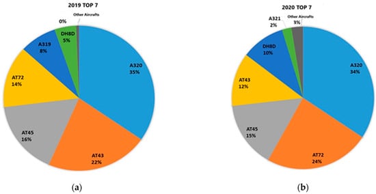 (a) Fleet composition in Alexandropoulis airport—2019. (b) Fleet composition in Alexandropoulis airport—2020. Abbreviations: A320—Airbus A320, A319—Airbus A319, AT43—ATR 42-300/320, AT45—ATR 42-500, AT72—ATR 72-200/500, DH8D—De Havilland Canada Dash 8 Q400.