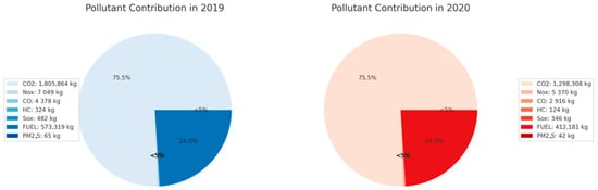 In 2019, carbon dioxide had the most extensive percentage distribution, accounting for 75.5% of total emissions, followed by fuels, which accounted for 24%, and the remaining pollutants, such as NOx, CO, HC, SOx, and PM2.5, had more minor impacts. In 2020, the same pattern is presented. Namely, carbon dioxide represents the most significant percentage of pollutants, while the rate of fuels, although decreasing compared to 2019, still has the second percentage distribution among them.