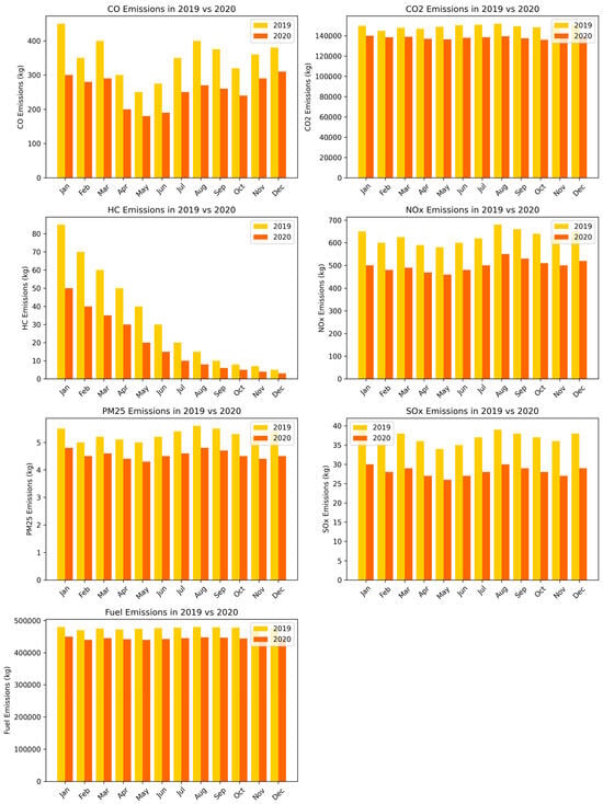 Comparison of monthly emissions for various pollutants in 2019 and 2020: CO; CO2; HC; NOx; PM2.5; SOx; fuel.