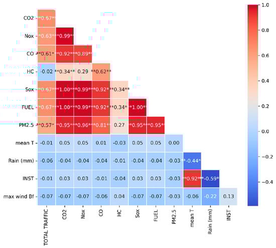 Figure 7 outlines the visual representation of the Pearson correlation coefficients between different pollutant concentrations (e.g., NOx, CO, SOx, PM2.5, CO2) and meteorological parameters (e.g., mean temperature, rain precipitation, wind speed). Briefly, the red tones imply positive correlations (closer to +1), the blue tones indicate negative correlations (closer to −1), while white or light colors demonstrate weak or absent correlations between the variables.