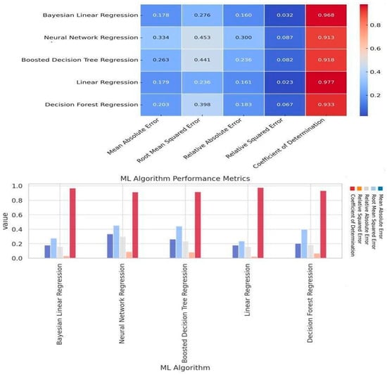 The robust evaluation framework of the models can be briefly explained as follows: A lower value signifies a more robust prediction ability regarding the mean absolute error. Likewise, a smaller value indicates more substantial predictive capabilities for root mean squared error. In the case of mean absolute error, better model performance is displayed by lower values. On the contrary, the coefficient of determination (R2) assesses the model’s predictive capacity, which is revealed to have higher values []. Supplementary Materials Figure S1 presents all modelling parameters extracted from the Microsoft Azure Studio Classic for regression machine learning algorithms.